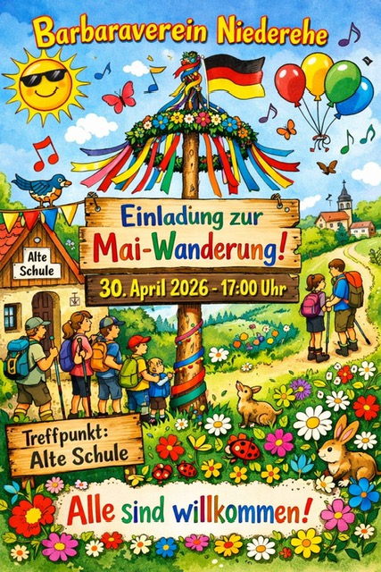Der Barbara-Verein Niederehe lädt alle Wanderer zur Mai-Wanderung ein.Wir treffen uns um 17:00 Uhr an der Alten Schule.
